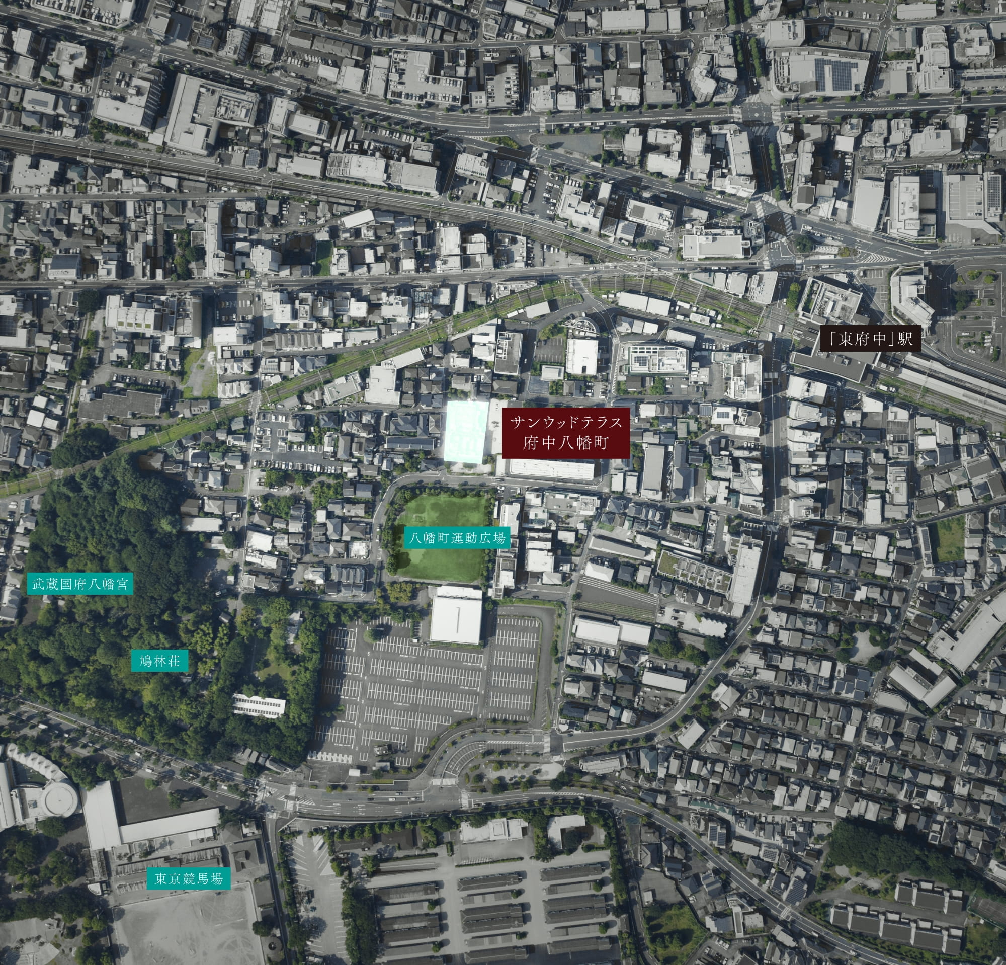武蔵国府八幡宮や競馬場通りなど、緑豊かな景観が広がる現地周辺。