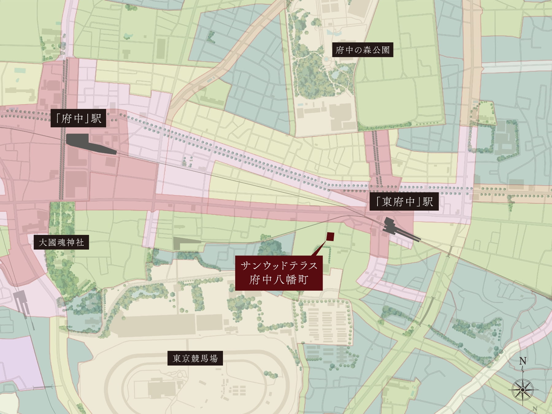 大型複合施設が集積する京王線「府中」駅と、心が解けるような緑の落ち着きに満ちた「東府中」駅。