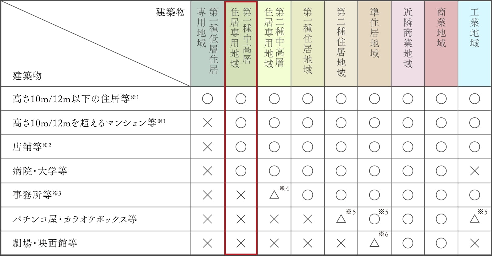 ※1.10mまたは12mの高さ制限は、都市計画で決定/※2.店舗等の床面積が150㎡以下の場合/※3.事務所等の床面積が150㎡以下の場合/※4.2階以下の場合/※5.床面積が10,000㎡以下の場合/※6.客席が200㎡未満の場合