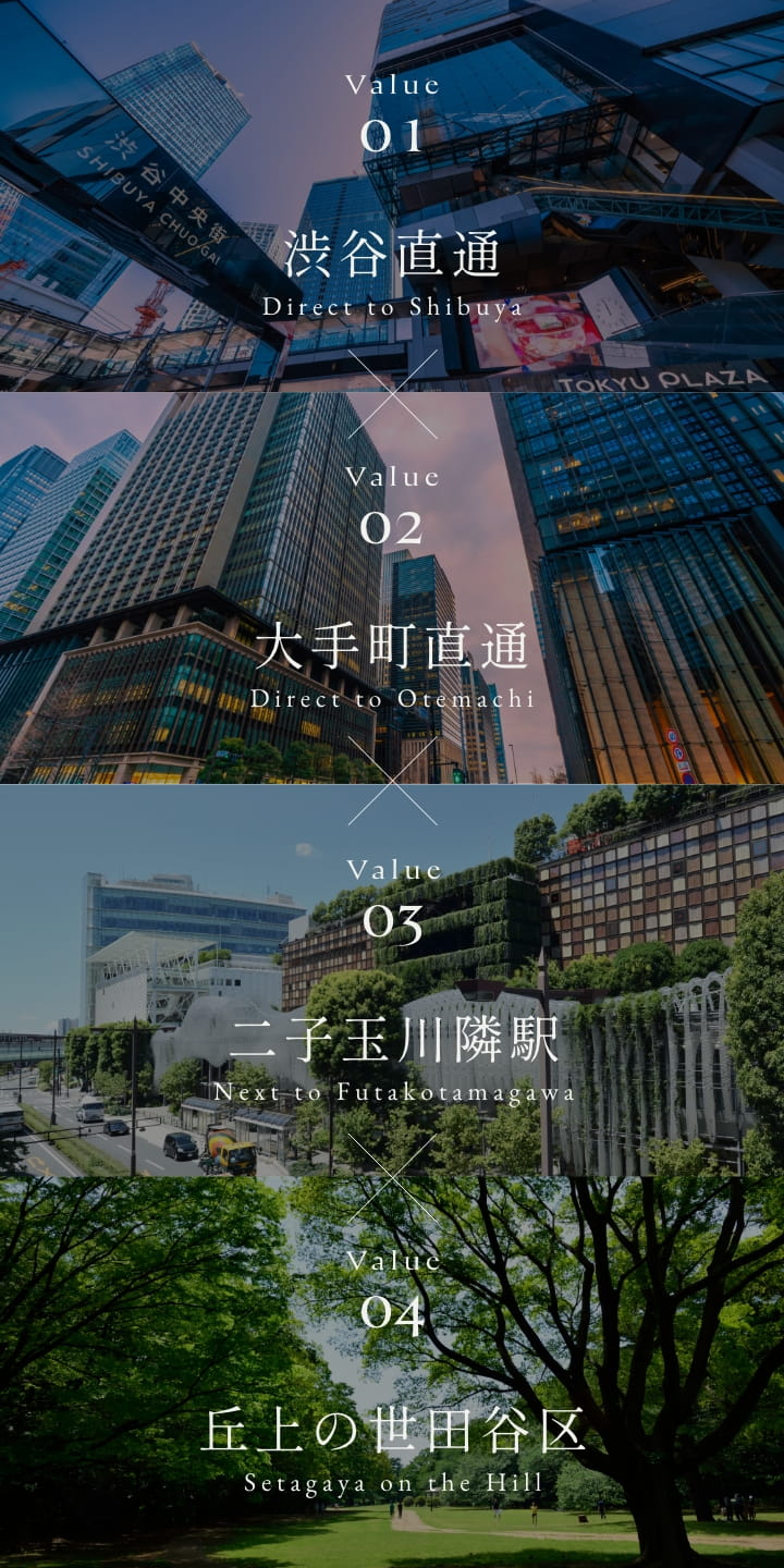 世田谷区の中でも、渋谷や都心への直通アクセスを備えた東急田園都市線。その利便を使いこなせる「用賀」駅を最寄りとする「サンウッド上用賀三丁目」は、沿線でも人気の二子玉川まで1駅、かつ自転車でも行き来でき、生活圏に収めるロケーション。さらに、二子玉川が見上げる高台の邸宅街という背景が、この地の魅力を特別なものにしている。