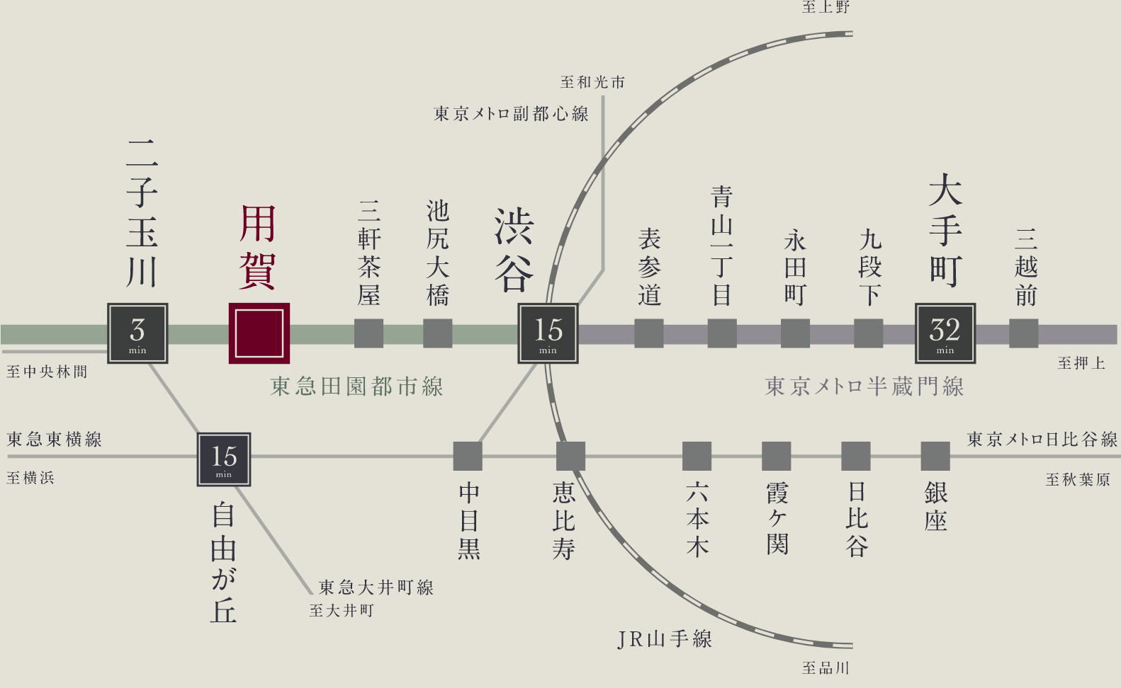 半蔵門線直通。都心の核心部へダイレクトに繋がる。