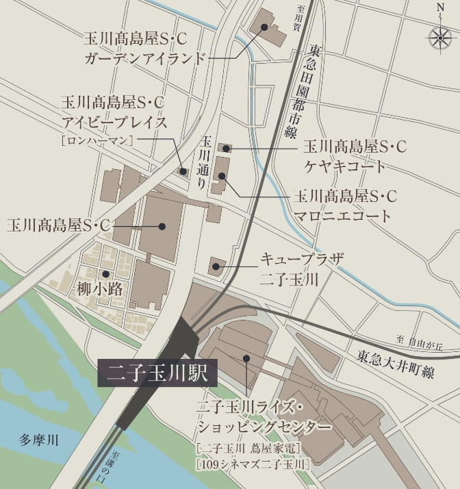 「玉川髙島屋S・C」や「二子玉川ライズ」などの大型商業施設が集積し、新しいライフスタイルを提案し続ける街。