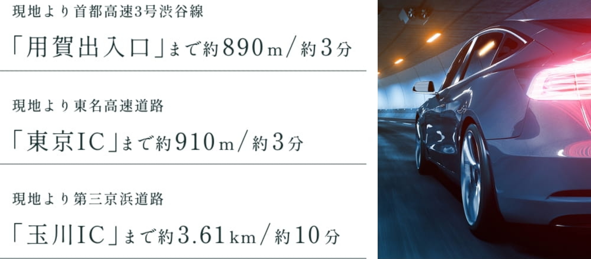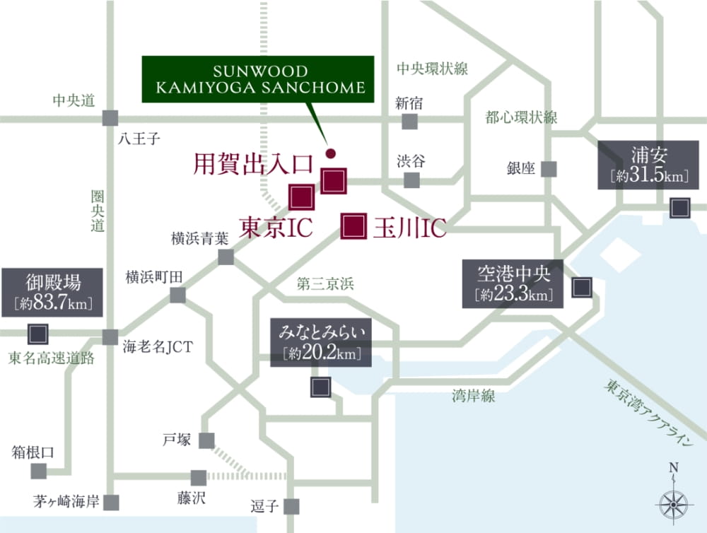 「用賀出入口」を至近にし、首都高速3号渋谷線を通じて都心環状線や湾岸エリアへアクセス。さらに東名高速道路を利用すれば、横浜や御殿場など、広域へのレジャーもスムーズ。アクティブな日常を支えるカーアクセスが、暮らしの幅を広げる。