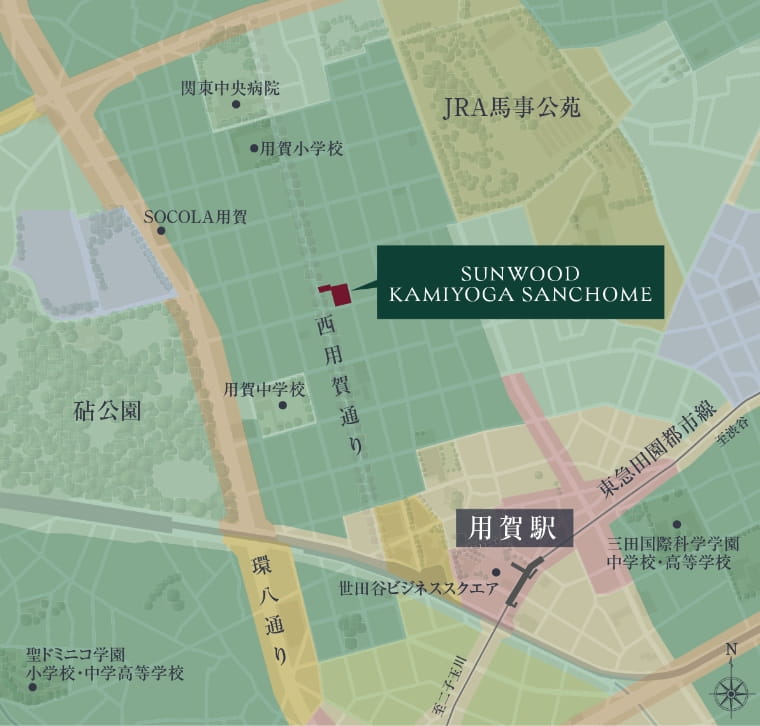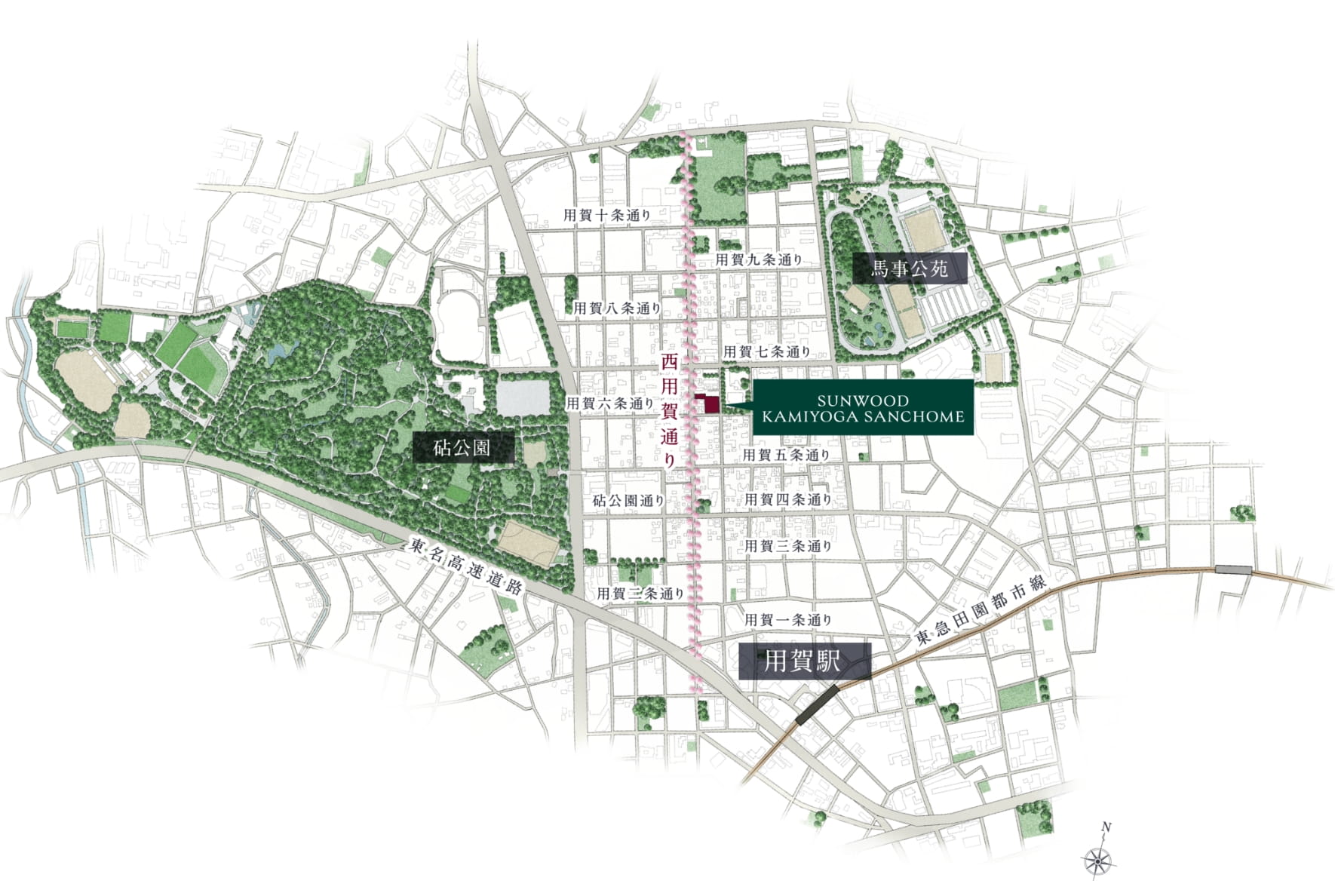 その中でも、第一種低層住居専用地域の静穏を享受し、西用賀通りの桜並木が続くこの地は、