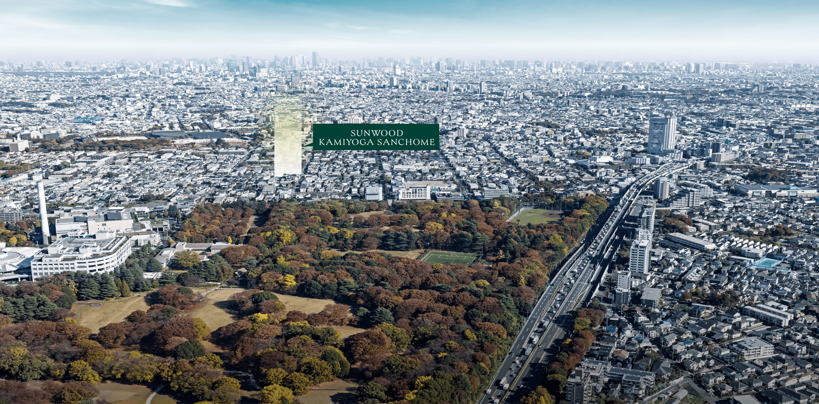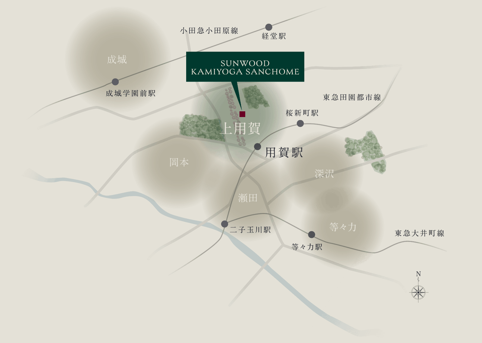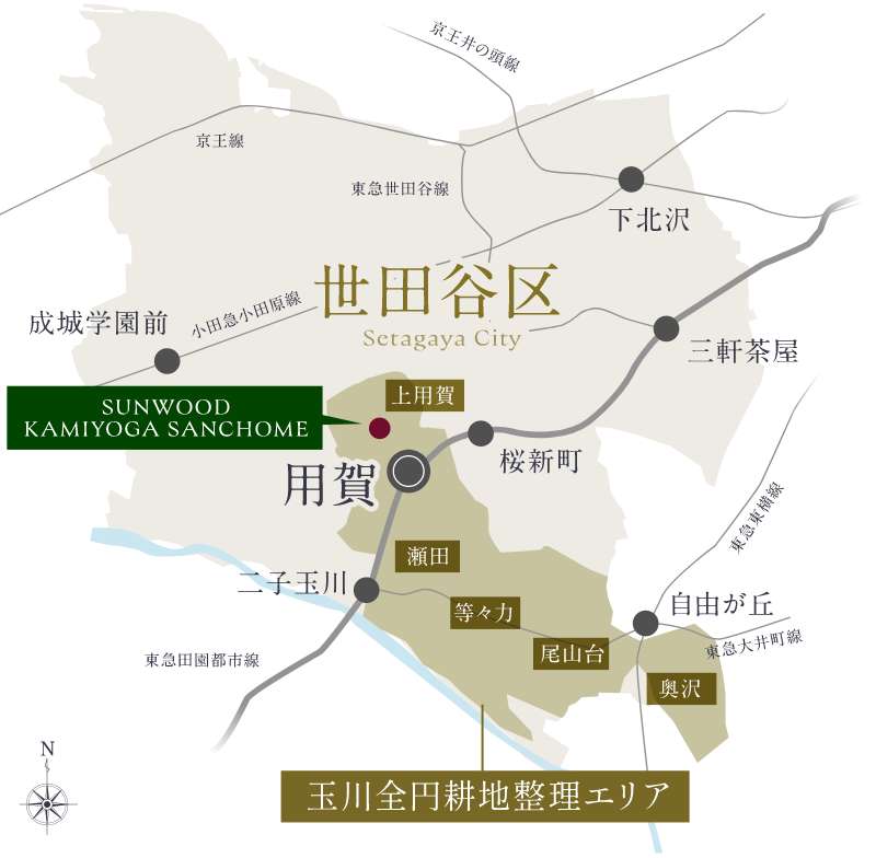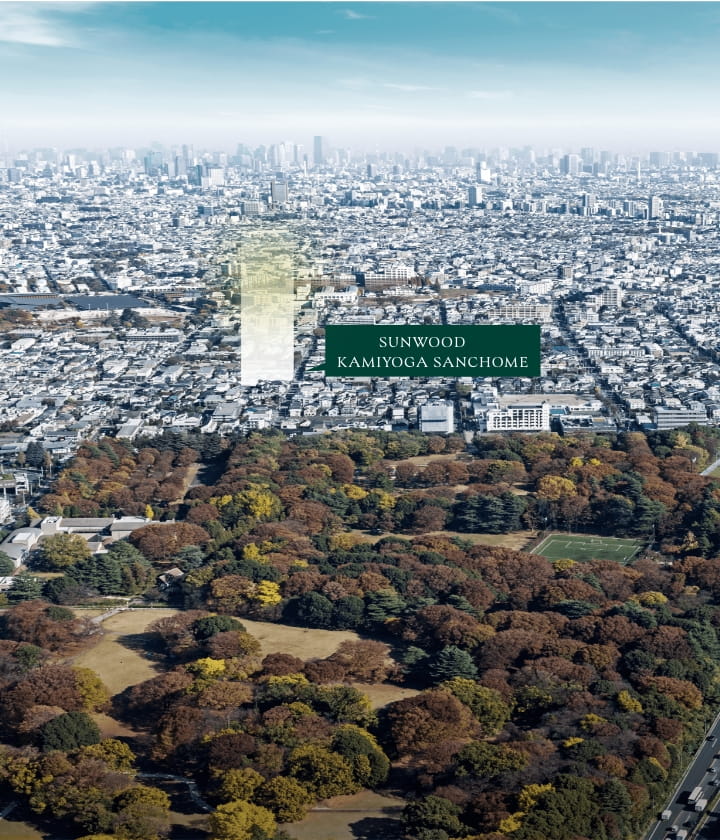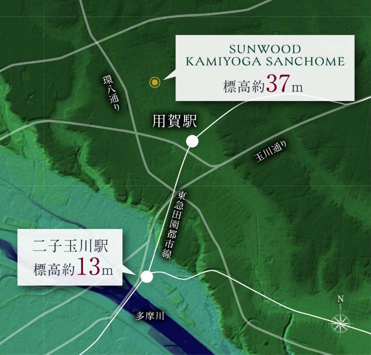 標高約37mの武蔵野台地上に位置する「サンウッド上用賀三丁目」。安定した地層で知られる関東ローム層に支えられた高台は、二子玉川駅周辺(標高約13m)よりも水害リスクが抑えられた安息感と爽快な暮らしをもたらす。