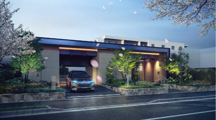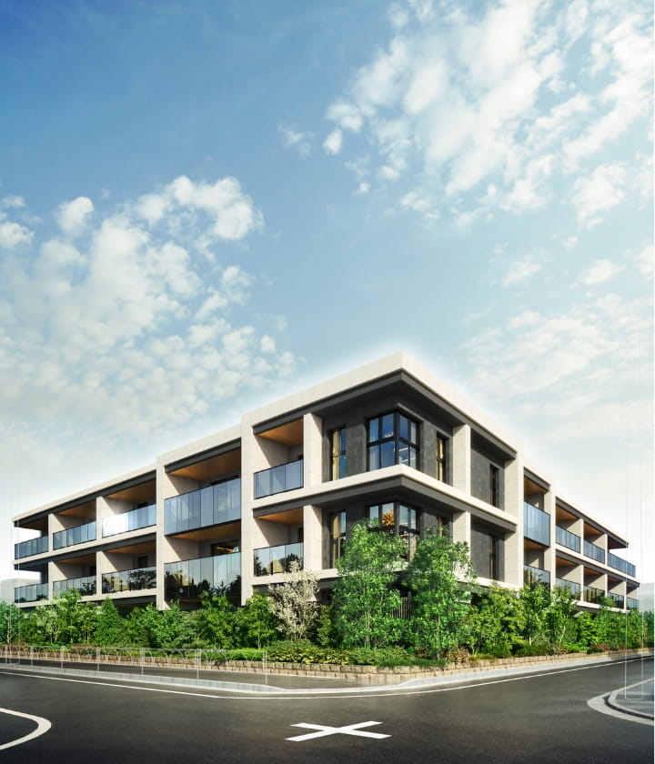 ※掲載の外観、エントランス、共用棟・居住棟断面、回廊、エントランスホール、中庭完成予想CG、敷地配置イラストは、計画段階の図面を基に描いたもので、形状・色等は実際とは異なります。なお、形状の細部、設備機器等は表現しておりません。また、植栽は、特定の季節やご入居時の状態を想定して描かれたものではありません。樹種等変更になる場合があります。周辺環境は将来変わる場合があります。共用部の家具・調度品・アート作品等は変更となる場合がございます。