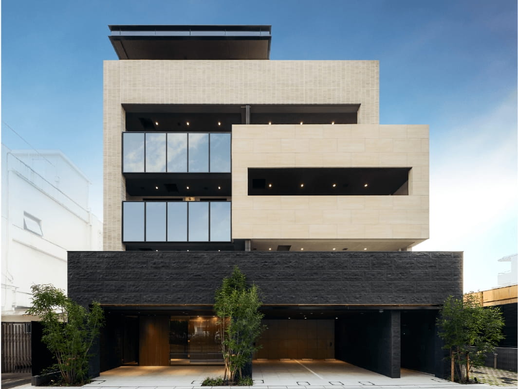 現代のプレイリースタイル。深い軒がもたらす陰影と、水平・垂直を強調したフォルム。自然と調和する邸宅建築の思想を現代的に解釈したデザインが、端正な佇まいを描く。外観には石調のタイルを採用し、ルーバーや軒天、ガラス、手摺などの異素材を組み合わせることで、強さと繊細さが共存するファサードを構築した。