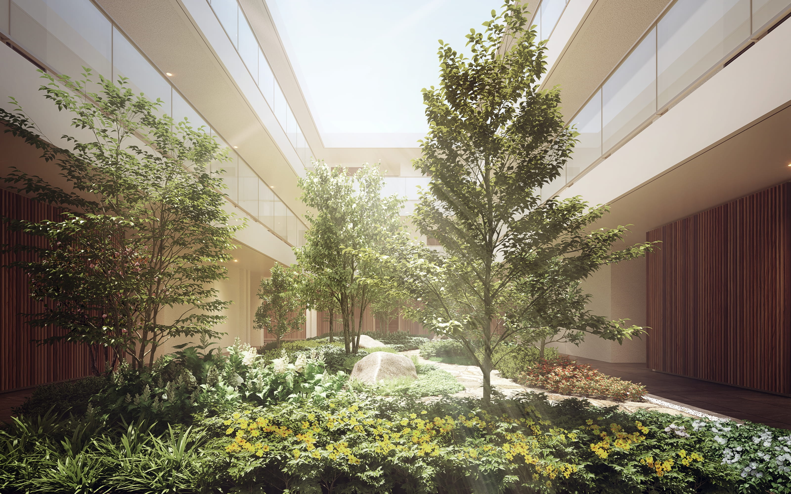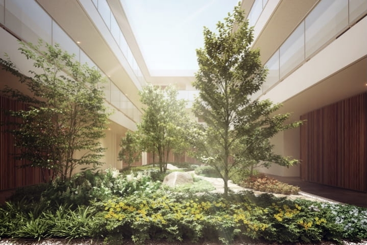 中庭には10種類以上の中高木による奥行きある木立を配し、