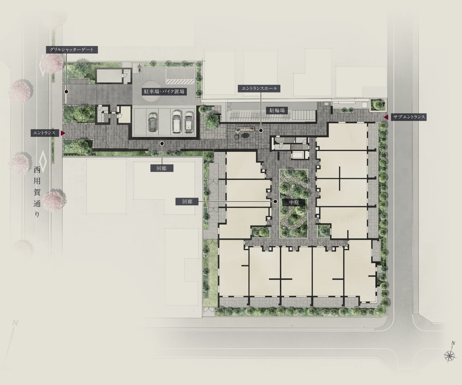 西用賀通りの桜並木を歩み進め、辿り着くのは端正な門構えのエントランス。