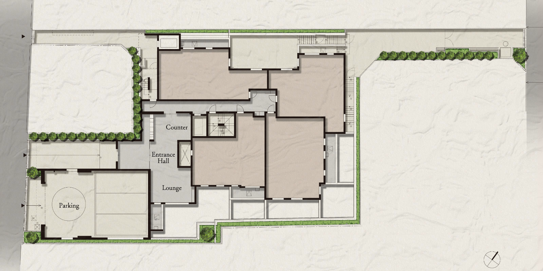 住宅街に佇む、隠れ家を思わせるランドプラン。
